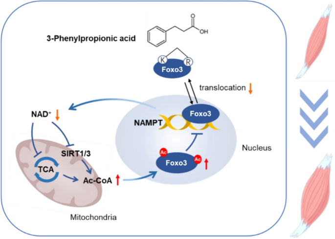 本研究的创新点在于:首次证实3-PPA可促进肌管肥大,并阐明其通过“直接结合Foxo3+抑制NAD⁺合成→降低SIRT1/3表达→促进蛋白乙酰化→抑制Foxo3活性→减少蛋白降解”的分子机制,填补了3-PPA在骨骼肌研究中的空白。