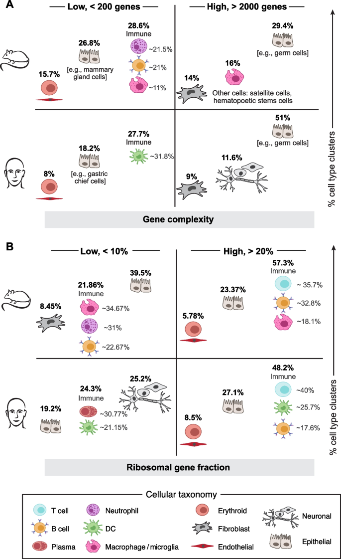 作者首先总结传统QC的现状——86%的已发表研究采用固定阈值(线粒体≤10%、基因数≥500),但这些阈值未考虑生物学变异;接着通过公共数据集分析指出,传统方法会过滤掉代谢活跃的实质细胞(如心肌细胞、肾小管细胞)和功能特化的免疫细胞(如中性粒细胞),导致生物信息丢失;随后,作者讨论现有数据驱动方法的局限——如miQC基于样本水平的贝叶斯模型调整阈值,但未解决细胞类型层面的变异问题,仍会丢失细胞类型特异的信息。