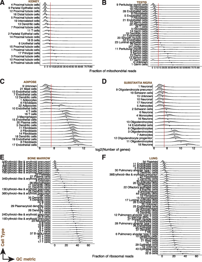 结果解读:QC指标存在显著组织/细胞类型特异性——如肾、心脏的线粒体比例显著高于其他组织;心肌细胞线粒体比例中位数15%(超过传统阈值10%),中性粒细胞基因数中位数180(低于传统阈值200)。传统固定阈值会过滤掉这些细胞,导致生物信息丢失。