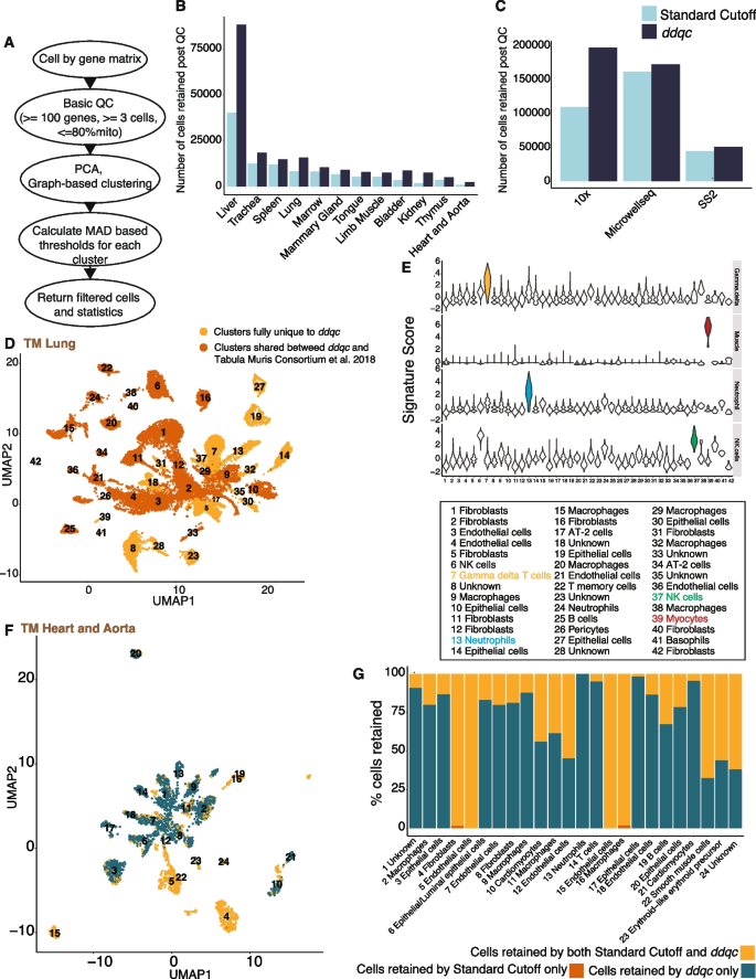 方法细节:在Tabula Muris(心脏、肺)、人类肺/心脏等数据集上测试,比较保留细胞数、恢复的细胞类型、下游功效。流程包括:① 独立QC(三种方法分别过滤);② 聚类分析(Louvain);③ 细胞类型注释(PanglaoDB);④ 差异基因分析(DEseq2)。