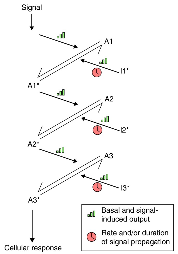 实验目的:探讨多步骤信号级联的信号传输速度优化机制,以及激活与抑制过程的调控差异。