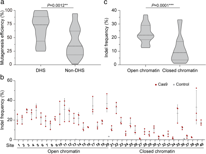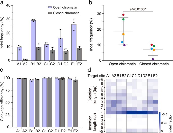 结果解读:开放染色质区域的indel频率显著高于闭合区域(图1a、c),如开放区域平均indel频率为25%,闭合区域为8%(n=70,P<0.001);5个sgRNA的开放区域indel频率是闭合区域的1.5-13.4倍(图2a、b),而体外染色质-free DNA的Cas9切割效率无差异(图2c),说明染色质结构而非序列决定编辑效率。