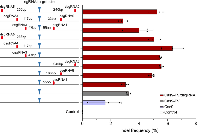 实验目的:测试近端dsgRNA对Cas9-TV的增效作用。