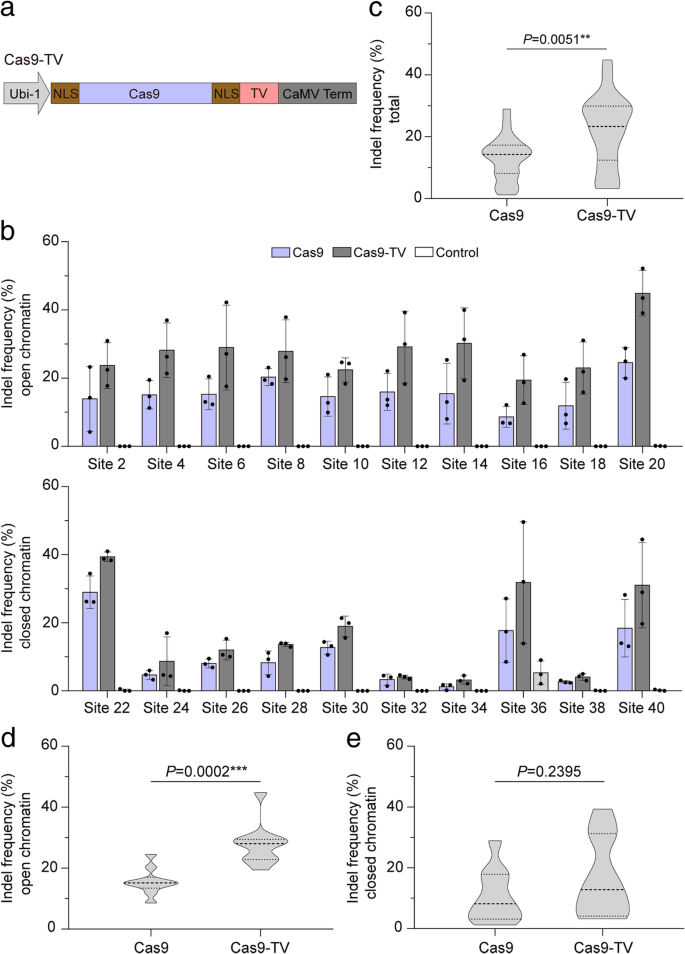 方法细节:将合成转录激活域TV(6个TALE蛋白转录激活域+8个VP16域)融合至Cas9 C端,构建Cas9-TV载体;选择20个sgRNA靶向不同染色质区域,将Cas9或Cas9-TV与sgRNA共转染水稻原生质体,48小时后提取基因组DNA,通过靶向深度测序检测indel频率。
