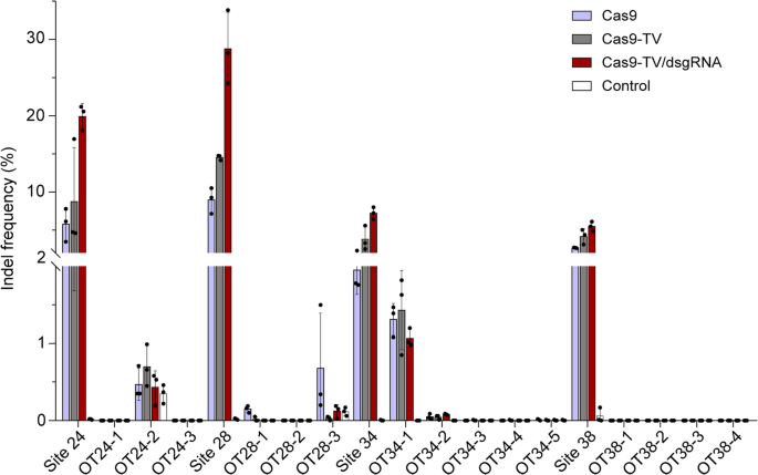 结果解读:Cas9-TV的on-target效率高于Cas9(如sgRNA34的on-target频率从10%提高到15%);脱靶频率与Cas9相似,部分位点(如OT28-3)的脱靶频率甚至更低(图7);未检测到新的脱靶位点,说明TV域与dsgRNA不增加脱靶风险。