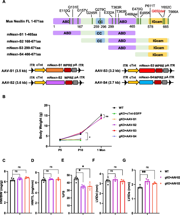 方法细节:构建Nexilin截断体(S1:缺失C端IGcam;S2:缺失N端ABD;S3:缺失N端ABD和卷曲螺旋域;S4:仅含C端IGcam),包装成AAV9-cTnt-截断体;注射到P0.5的Nexn gKO小鼠,1个月后检测体重、超声参数(FS、LVIDd)。