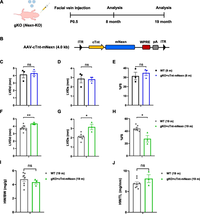 方法细节:将AAV-cTnt-mNexn注射到P0.5的Nexn gKO小鼠,分别在8个月和19个月检测超声参数(LVIDd、FS)及HW/BW。