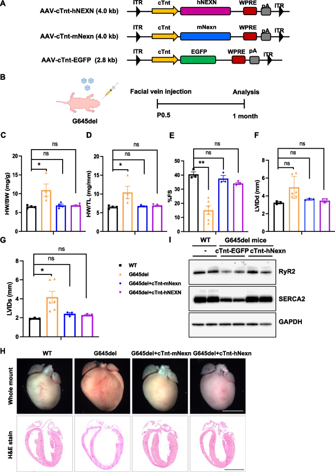 方法细节:构建AAV9-cTnt-hNEXN(人全长长NEXN),注射到P0.5的G645del小鼠面部静脉;对照组注射AAV-EGFP;1个月后检测超声参数(FS、LVIDd)、心脏H&E染色及Ca²+处理蛋白(RyR2、SERCA2)表达(免疫印迹)。