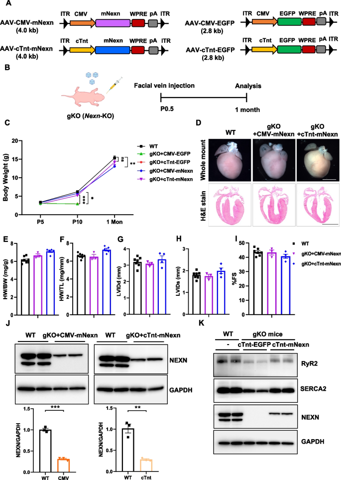 方法细节:将AAV-CMV-mNexn或AAV-cTnt-mNexn(1×10¹¹ vg)注射到P0.5的Nexn gKO小鼠面部静脉;对照组注射AAV-EGFP;1个月后检测体重、心脏H&E染色、超声心动图(HW/BW、LVIDd、FS)及心肌Nexilin表达(免疫印迹)。