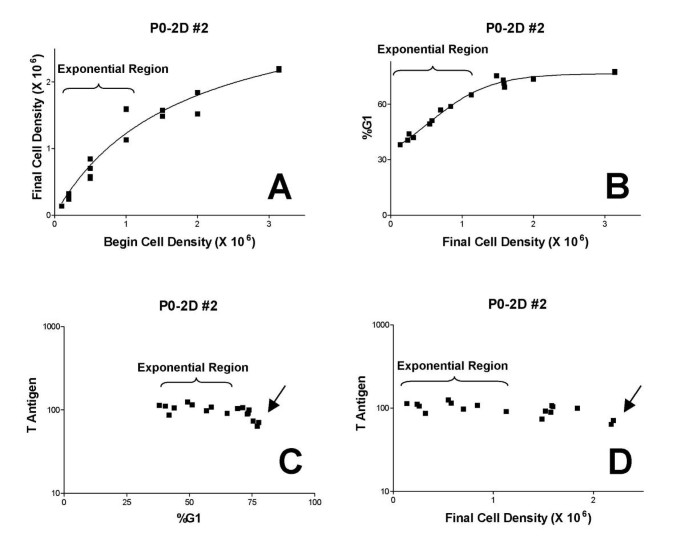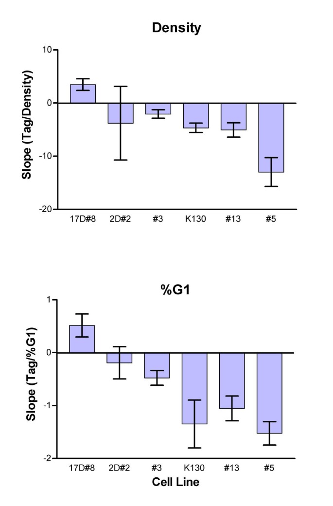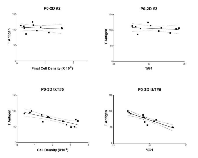 方法细节:选择对密度最敏感的细胞系P0-3D tkT#5,用含2.5-10%血清的DMEM培养3天,检测Tag水平(流式细胞术)和G₁期比例。