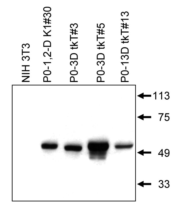 方法细节:从新生C57BL/6小鼠皮层分离原代星形胶质细胞,用携带Tag的逆转录病毒感染(LTR启动子:SV40-6(野生型Tag)、SV(X)T^K1(Rb结合突变型Tag);htk启动子:Linker-tkT),通过G418筛选获得单克隆细胞系。为验证星形胶质细胞 lineage,将早期传代细胞用二丁酰环腺苷酸(dibutyryl cAMP)处理以增强胶质纤维酸性蛋白(GFAP)表达,提取中间丝蛋白进行Western blot,用多克隆抗GFAP抗体(DAKO)检测。
