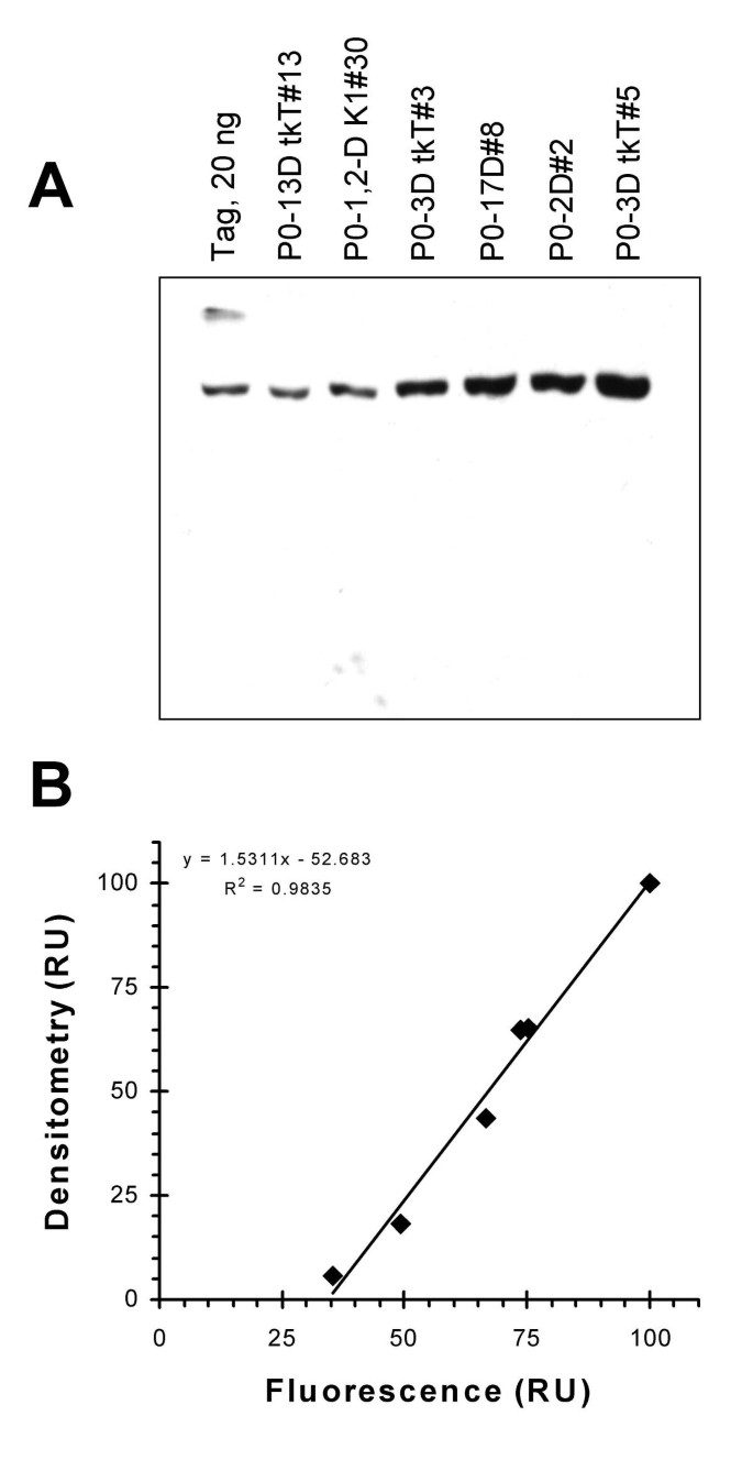 方法细节:制备细胞提取物(10% SDS裂解缓冲液,含蛋白酶抑制剂),与纯化的重组Tag(杆状病毒表达)一起进行SDS-PAGE电泳;转印到PVDF膜,用PAb416抗体孵育过夜,然后用碱性磷酸酶标记的二抗孵育,化学发光法(CDP-Star底物)显影;通过densitometry分析条带强度,与流式细胞术的总Tag荧光进行相关性分析。