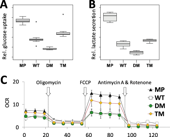 实验目的是验证PGRMC1磷酸化突变对糖代谢及线粒体功能的影响。方法:① 糖代谢:用Cayman试剂盒检测葡萄糖摄取和乳酸分泌;② 线粒体功能:用NpFR2 redox传感器检测基质氧化态,MitoTracker染色结合流式细胞术检测膜电位(Δψm),Seahorse XF24分析仪检测呼吸速率(OCR)。结果:① DM细胞葡萄糖摄取较WT降低40%(n=12,Kruskal-Wallis,P<0.0001),乳酸分泌降低30%(n=6,ANOVA,P<0.003);② WT/TM细胞线粒体基质更氧化(NpFR2荧光强度高2倍),DM细胞线粒体膜电位(MitoTracker荧光)低30%;③ Seahorse实验显示,DM细胞基础呼吸速率较WT低50%,最大呼吸速率低60%(n=5,mean±s.d.,P<0.05)。进一步分析发现,WT细胞中线粒体融合蛋白Opa1表达较DM高40%,提示PGRMC1磷酸化调控线粒体融合/分裂。实验所用关键产品:Cayman葡萄糖摄取试剂盒(600470)、MitoTracker Red(Invitrogen,M7512)、Seahorse XF24分析仪(Agilent)。