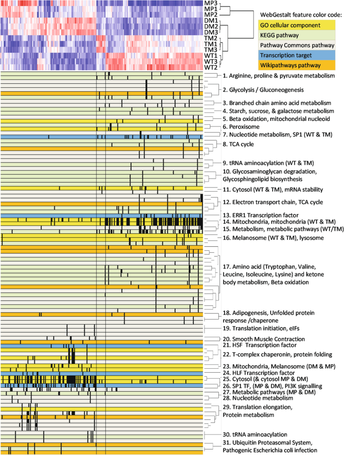实验目的是解析PGRMC1磷酸化突变对细胞蛋白质组的影响。方法:收集WT、DM、TM及亲本MP细胞,提取蛋白后通过SWATH-MS(ABSciex 5600 TripleTof质谱仪)进行定量蛋白质组学分析。结果:共鉴定1330种可靠蛋白(至少2个肽段),其中243种差异表达(fold change>1.5,P<0.05)。主成分分析(PCA)显示,差异蛋白主要富集于能量代谢(如ATP合酶亚基)、线粒体功能(如TOM40)、细胞骨架(如微管蛋白)等通路。例如,WT细胞中能量代谢蛋白(如磷酸果糖激酶,P08237)表达较DM高30%,而DM细胞中细胞骨架蛋白(如vinculin,P18206)表达较WT高40%。实验所用关键产品:TripleTof 5600质谱仪(ABSciex)、PeakView 2.1数据分析软件。