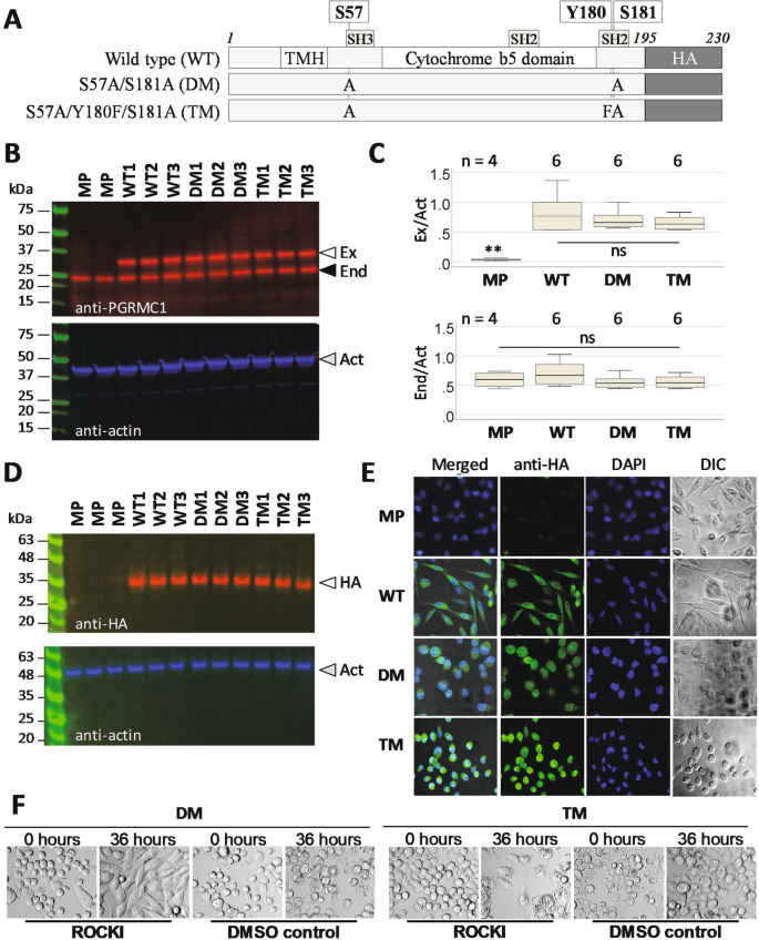 实验目的是获得表达不同PGRMC1磷酸化突变体的稳定MIA PaCa-2细胞系。方法:构建携带HA标签的PGRMC1野生型(WT)、双突变体(DM,S57A/S181A,突变两个丝氨酸磷酸化位点)和三突变体(TM,S57A/Y180F/S181A,额外突变酪氨酸位点Y180)质粒,通过Lipofectamine 2000转染细胞,经50μg/ml潮霉素筛选2周获得稳定株。结果:Western blot验证显示,外源性PGRMC1-HA(~32kDa)与内源性PGRMC1(~24kDa)表达水平相当(n=4 lanes for MP,n=6 for WT/DM/TM,ANOVA无显著差异);抗HA抗体进一步确认外源性蛋白表达。实验所用关键产品:HA标签抗体(Sigma-Aldrich,H3663)、Lipofectamine 2000(Invitrogen,11668-019)。