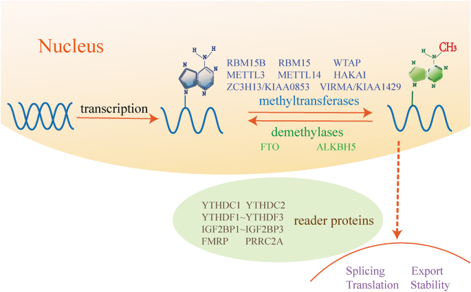 结果解读:m6A修饰是可逆过程——writers以METTL3/14为核心,结合WTAP、VIRMA等辅助因子催化甲基化;erasers(FTO、ALKBH5)通过氧化去甲基化清除修饰;readers(如YTHDF2)识别m6A位点并促进RNA降解。文中图1(