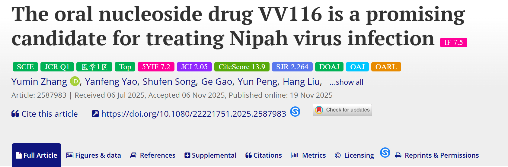 在国际权威期刊《新兴微生物与感染》(Emerging Microbes & Infections)上,肖庚富、张磊砢、单超研究团队联合上海药物研究所及旺山旺水生物医药公司,共同发表了关于**VV116(氢溴酸氘瑞米德韦片)**的最新研究。