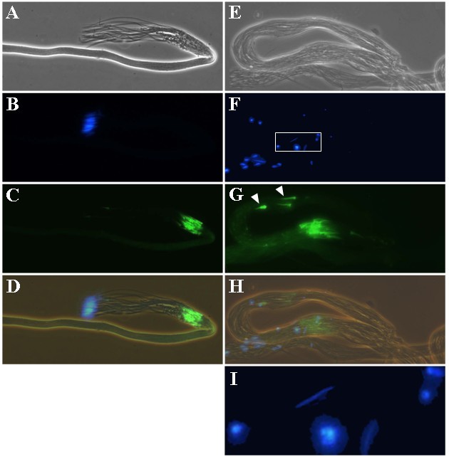 结果解读:① 减数分裂异常:Mer3突变体精母细胞出现三种异常——a)减数分裂II胞质分裂失败,导致精子含两个等大细胞核和两个Nebenkern(图3A);b)减数分裂II出现三极纺锤体(图3B);c)减数分裂II出现四极纺锤体(图3C-E),提示减数分裂I胞质分裂不完全。这些异常约占Mer3囊肿的5%(n=100)。② 囊泡极化异常:野生型精子形成前,细胞核聚集于囊泡壁的一个区域(图4A);Mer3和Mer4突变体中,细胞核分散为两个或多个群体(图4B-E、4F-H),Mer4突变体的异常率高达90%(n=20),Mer3约50%(n=30)。③ 精子个体化异常:野生型中,actin锥形成于精子头部并向尾部移动(图5A-D),精子头部呈针状;Mer3突变体中,actin锥分散于多个位点,精子细胞核形态异常(部分圆形,图5E-I)。