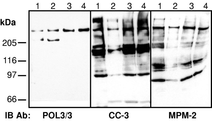 产品关联:文献中使用的关键抗体包括CC-3(实验室自制)、MPM-2(Upstate Biotechnology)、NMT-5(兔多克隆,A. M. Traish馈赠)、抗SAP155(兔多克隆,R. Reed馈赠)等;质谱分析由Centre de protéomique de l"est du Québec完成,领域常规使用MALDI-TOF质谱仪(如Applied Biosystems Voyager DE PRO)。