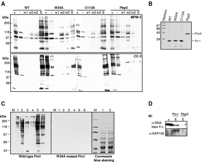 方法细节:将His-tagged野生型Pin1、WW结构域突变体(W34A)、PPIase结构域突变体(C113A)及对照蛋白Pbp5固定于镍柱,与有丝分裂提取物孵育后,通过pulldown实验检测结合的CC-3/MPM-2抗原;对免疫纯化的CC-3/MPM-2抗原进行blot overlay实验,以Pin1或W34A为探针检测直接相互作用。
