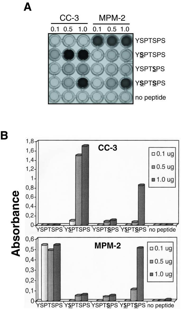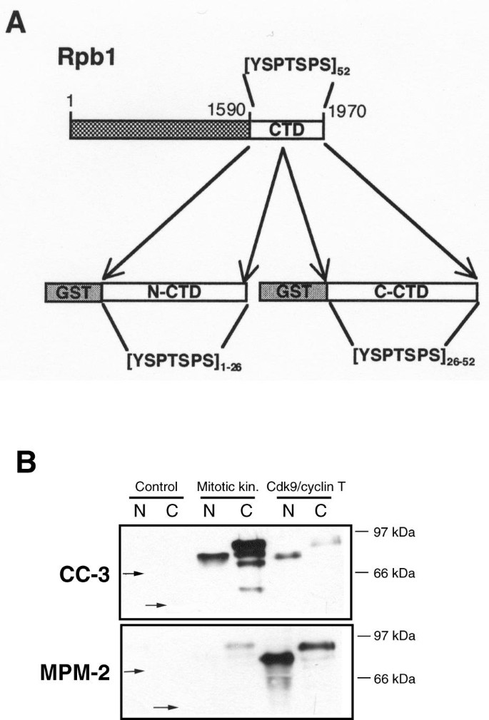 方法细节:构建GST融合的CTD N-末端(26个保守YSPTSPS重复)和C-末端(26个非保守重复)片段,分别用有丝分裂提取物或Cdk9/cyclin T1激酶体外磷酸化,免疫印迹检测CC-3/MPM-2的反应性;合成生物素化的CTD肽段(含4个YSPTSPS重复,磷酸化Ser2、Ser5或两者),通过ELISA检测抗体结合能力。