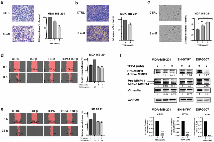 方法细节:①Transwell迁移/侵袭实验:MDA-MB-231细胞用TEPA处理(0/4/8 mM,24 h),接种于Transwell小室,测量迁移/侵袭细胞数;②划痕实验:MDA-MB-231(4 mM TEPA)、SH-SY5Y(2 mM TEPA)预处理2 h,加入TGF-β(15 ng/ml for MDA-MB-231,10 ng/ml for SH-SY5Y),IncuCyte S3监测伤口愈合率。