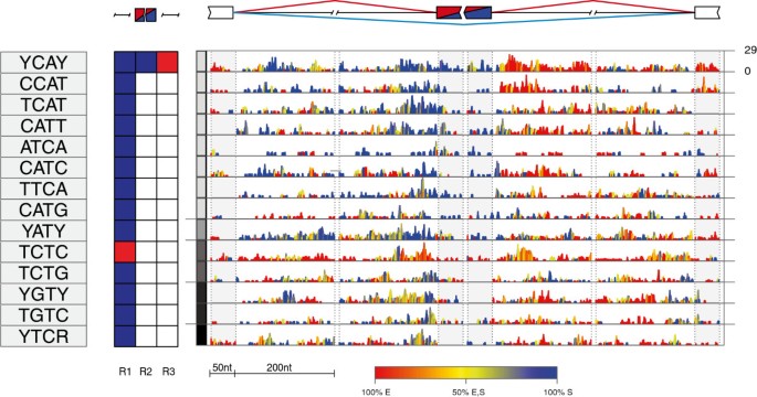 结果解读:对于NOVA调控的外显子,识别到14个富集的四聚体,其中8个属于YCAY家族(如TCAT、CCAT),这些基序在增强外显子下游(r3)和沉默外显子上游(r1)显著富集,与已知的NOVA调控位置完全一致;对于hnRNP C,富集的四聚体为TTTT和YTTY,主要在沉默外显子的3′剪接位点下游富集,与iCLIP数据一致。