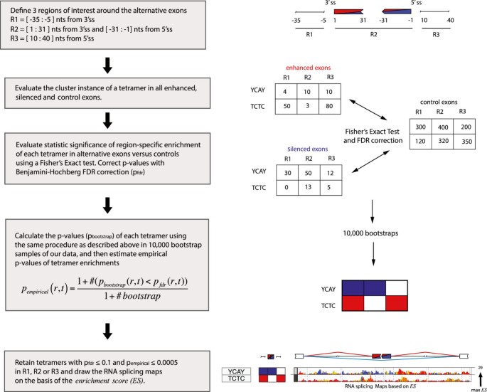 技术路线:定义多价基序→选择感兴趣区域→统计分析基序富集→构建RNA剪接图谱→多数据集验证(RBP敲除/敲低、混合数据集、组织特异性数据)。