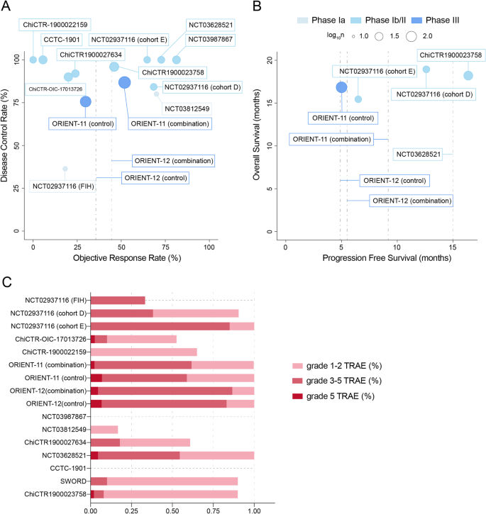 方法细节:汇总12项研究的不良反应数据,按单药/联合分类统计:①单药治疗:所有级别治疗相关不良反应(TRAE)发生率16.7%-100%,3级以上TRAE发生率0-25%,致命TRAE发生率0-2.5%(1/40例);②联合铂类化疗:所有级别TRAE发生率99.6%-100%,3级以上TRAE发生率61.7%-86.6%,但致命TRAE发生率(2.3%-4.5%)低于化疗组(6.7%-6.9%);③联合安罗替尼:所有级别TRAE发生率100%,3级以上TRAE发生率54.5%,致命TRAE发生率4.5%(1/22例)。