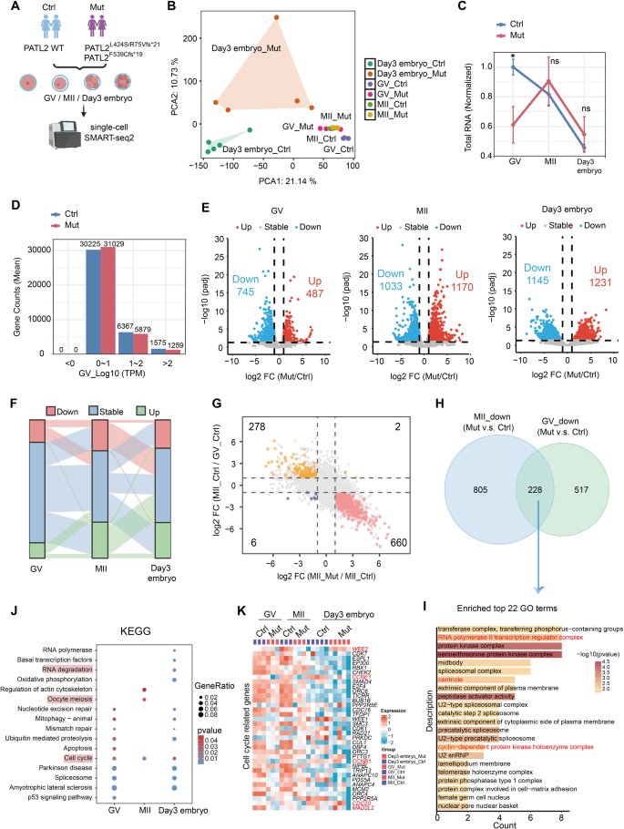 方法细节:收集OMD患者(携带PATL2突变)及对照的GV、MII卵母细胞和Day3胚胎,通过SMART-seq2技术进行低输入RNA测序(RNA-seq),分析mRNA表达水平及降解模式。