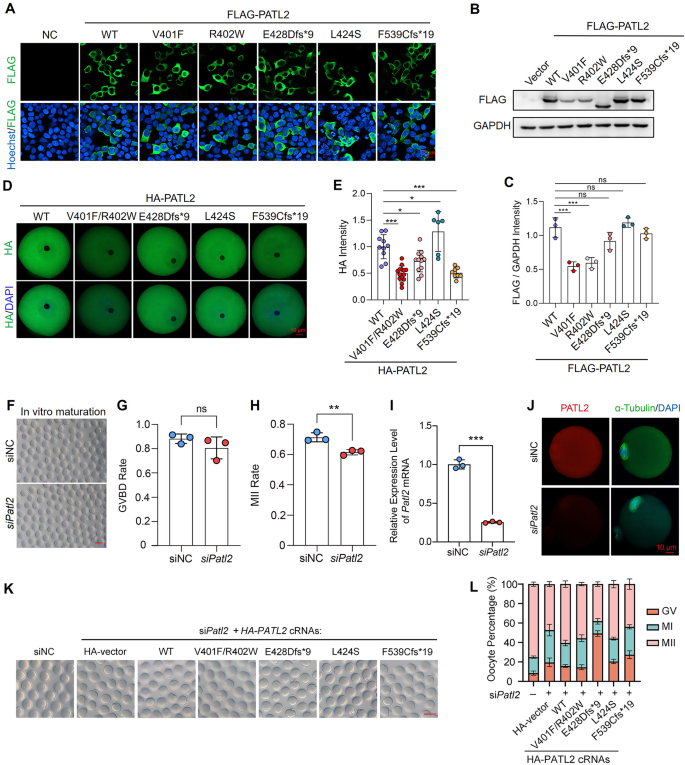 方法细节:HEK293T细胞转染FLAG-PATL2 WT或突变体,免疫荧光观察定位;Western blot检测蛋白水平;小鼠GV卵母细胞显微注射HA-PATL2 cRNA,免疫荧光观察定位及表达强度。