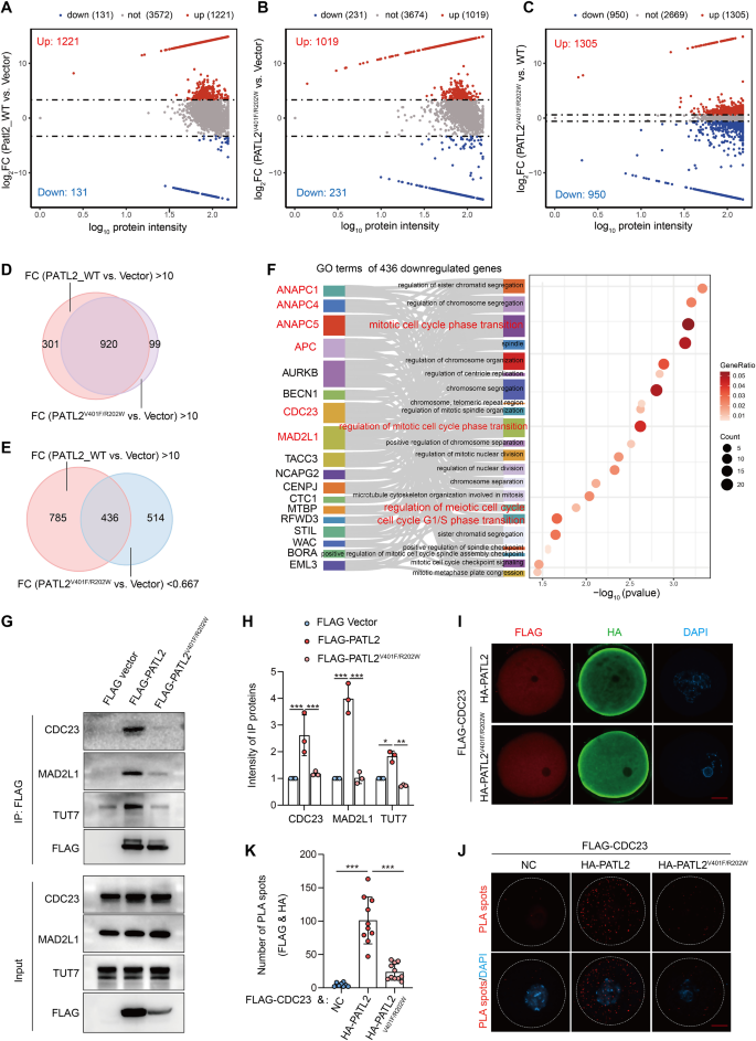 方法细节:HEK293T细胞转染HA-PATL2 WT或突变体,Co-IP结合质谱(mass spectrometry, MS/MS)分析相互作用蛋白;Co-IP验证与CDC23(细胞周期调控因子)、MAD2L1(纺锤体组装 checkpoint)、TUT7(mRNA降解调控因子)的相互作用;小鼠卵母细胞显微注射FLAG-CDC23和HA-PATL2,通过邻近连接技术(proximity ligation assay, PLA)检测蛋白相互作用。