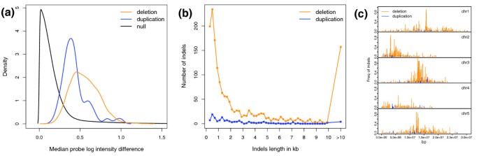 方法细节:对gDNA杂交的.CEL文件进行空间校正和log转换,用Bioconductor包Siggenes检测SFP(5% FDR);用segmentation算法分析探针水平p值(H₁: μVan > μCol),识别缺失(median p>0.99)和重复(median p<0.02)。