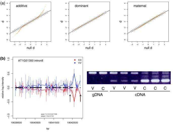 方法细节:对外显子探针,用基因表达水平校正后分析差异;对内含子探针,直接分析强度差异(内含子保留的信号更高);用线性模型检测加性效应,RT-PCR验证(Primer3设计引物)。