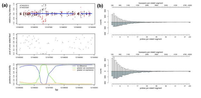 方法细节:对cDNA杂交的探针p值(H₁: μVan > μCol)构建广义HMM,含3个隐藏状态(相等、Van高、Col高);用Baum-Welch算法估计发射概率与转移概率,Forward-Backward算法计算后验概率,识别差异片段(posterior>0.99)。