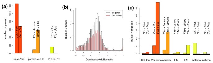 实验目的:解析Col、Van及其正反交F₁的基因表达变异,区分加性(父母本差异)、显性(F₁偏离中亲值)和母性(正反交F₁差异)效应。