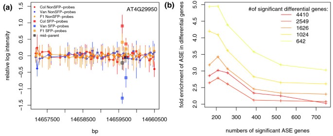 方法细节:筛选含≥5个非SFP探针和≥1个SFP探针的基因,用非SFP探针估计基因表达水平,校正SFP探针的强度;以基因组DNA杂交的中亲值为参考,分析F₁杂交种的RNA杂交数据,通过线性回归检测ASE,permutation计算FDR。