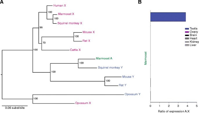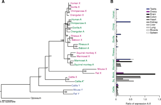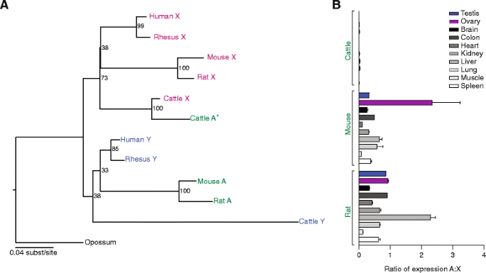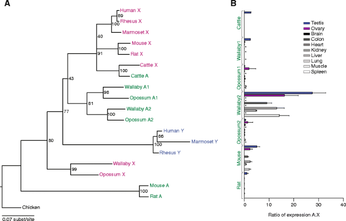 方法细节:下载GenBank中的RNA-seq数据集(覆盖脑、肝、肾、睾丸等多组织),用Bowtie将reads映射到常染色体与性连锁同源物,计算归一化后的表达量比值(常染色体/性连锁)。