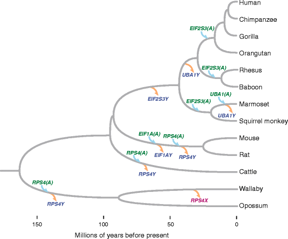 结果解读:发现4个基因(EIF1A、EIF2S3、RPS4、UBA1)在至少一个谱系中存在常染色体转座拷贝——例如啮齿类(小鼠、大鼠)丢失EIF1AY,但存在常染色体EIF1A拷贝;灵长类(人、恒河猴)丢失EIF2S3Y,但存在常染色体EIF2S3拷贝。