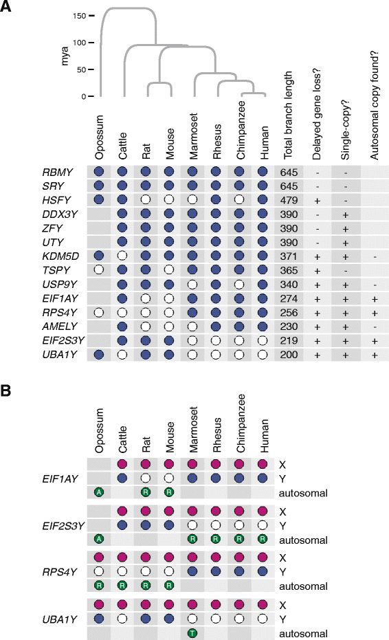 (Figure 1:展示8种哺乳动物Y连锁基因分布及常染色体同源物)