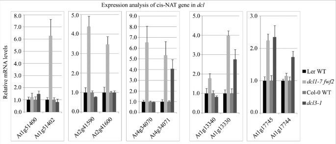 结果解读:①dcl1-7突变体中23.7%的cis-NAT基因(22/93)上调,显著高于全基因组水平(7.9%),表明DCL1依赖的nat-siRNAs可顺式下调靶标NAT转录本;②qRT-PCR验证显示,At1g51402在dcl1-7 fwf2突变体中上调6倍(图6),At1g13330在dcl1-7 fwf2突变体中上调4倍(图6),而在dcl3-1突变体中无显著变化,进一步支持DCL1依赖的nat-siRNAs的调控作用;③胁迫响应分析显示,拟南芥80对、水稻37对cis-NATs的nat-siRNAs在至少一种胁迫下表达变化≥2倍(如拟南芥At2g41590/At2g41600的nat-siRNAs在盐胁迫下上调),提示其参与植物胁迫响应。