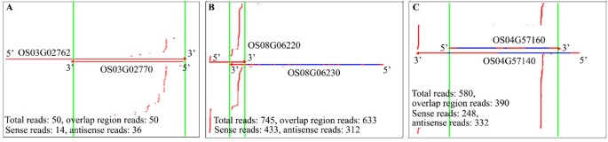 - 分布式:siRNAs分散于重叠区或整个转录本(如拟南芥At2g41590/At2g41600对,图1j;水稻OS08G06220/OS08G06230对,图2b);