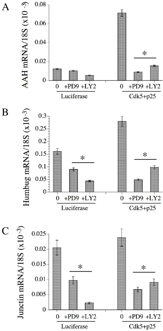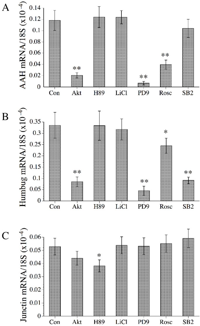 图4显示抑制剂对AAH(A)、Humbug(B)、Junctin(C)mRNA的影响,Akt/Erk/Cdk-5抑制剂显著抑制AAH。
