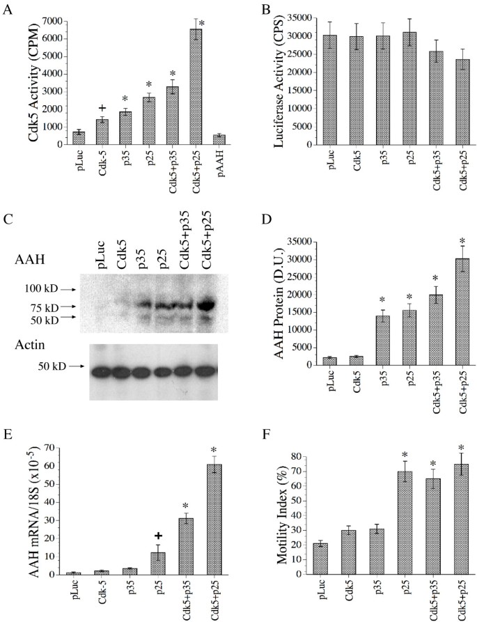 图6显示转染后Cdk-5活性(A)、AAH蛋白(C)、mRNA(E)及细胞运动(F)的变化,Cdk-5+p25组效果最显著。
