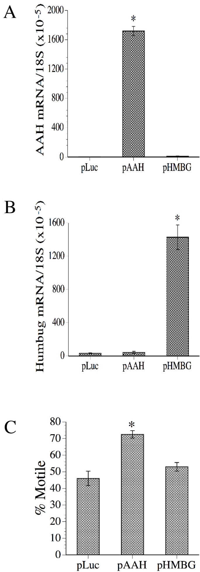 结果解读:pAAH转染组的AAH mRNA水平较对照高约5倍(n=6,P<0.001),细胞运动指数增加约40%(P<0.001);pHMBG组的Humbug mRNA高约4倍,但运动无显著变化,提示AAH是促进细胞运动的关键因子。