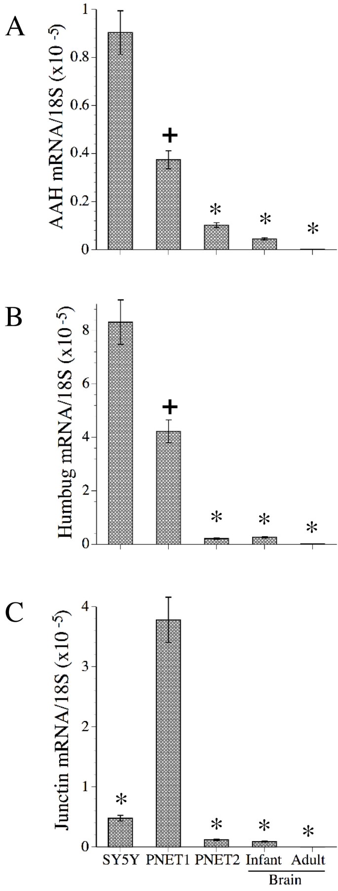 图1显示不同样本中AAH(A)、Humbug(B)、Junctin(C)的mRNA水平,肿瘤细胞中的表达显著高于正常脑组织。