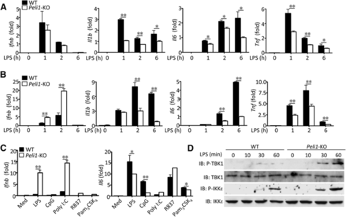 方法细节:构建Peli1基因敲除(KO)小鼠和野生型(WT)小鼠,分离培养骨髓来源巨噬细胞(BMDM)和原代小胶质细胞;分别用不同TLR配体(LPS、CpG、R837等)刺激细胞,采用实时定量聚合酶链反应(qRT-PCR)检测IFN-β及促炎细胞因子的mRNA表达水平;采用免疫印迹(免疫印迹(IB))检测TBK1和IKKε的磷酸化水平。
