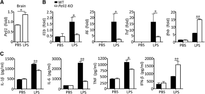 结果解读:LPS刺激后,Peli1-KO小鼠脑组织中Peli1表达上调,促炎细胞因子表达降低,而IFN-β的mRNA和蛋白水平均显著高于WT小鼠,与体外小胶质细胞实验结果一致,证实Peli1在体内负调控脑内IFN-β的产生。