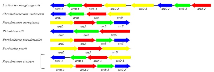 - 酸抵抗机制:鉴定出一个完整的脲酶基因盒(包含8个编码序列),可水解胃内尿素产生氨以提升局部pH;同时发现两个相邻的精氨酸脱亚胺酶(arc)基因簇,通过将精氨酸转化为氨以适应酸性环境,进化分析显示该基因簇与紫色色杆菌同源性最高,且该菌是目前已知唯一携带两个相邻arc簇的细菌。