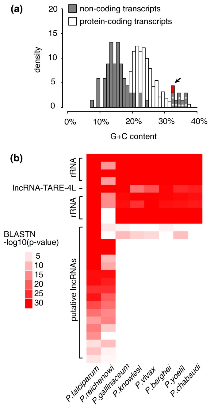 结果解读:60个长链非编码RNA候选的平均G+C含量为15.4%,低于蛋白编码基因的23.7%,其中lncRNA-TARE-4L的G+C含量为32.1%,与核糖体RNA相近;进化保守性分析显示19个候选在至少一种其他疟原虫物种中保守,而lncRNA-TARE-4L在所有8种测试物种中高度保守(P=0.045);相关性与距离分析显示23个候选为独立转录本,其中lncRNA-TARE-4L与邻近基因表达负相关(r=-0.296),且距离最近的var基因超过20kb,明确为独立转录本。